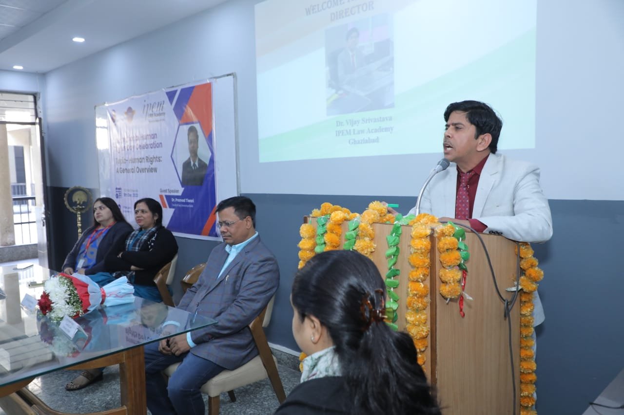 The International Human Rights Day celebration was organized on 09th December 2023 at IPEM Law Academy Conference Hall from 11.00 am onwards. Dr. Pramod Tiwari, Faculty of Law Delhi University was the Guest Speaker of the Day. The Program began with the Introductory Note and Welcome Address by Dr. Vijay Srivastava, Director, of IPEM Law Academy. The Guest Lecture of Dr. Pramod Tiwari, Faculty of Law Delhi University, was honored to share insights as the esteemed guest lecturer on International Human Rights Day. He focused on the importance of Human Rights in the country along with the discussion of various important articles of the Constitution as well as the Universal Declaration of Human Rights (UDHR). Students from the BComLLB, BALLB, and LLB came together to stage a compelling Nukkad Natak The performance served as a vibrant platform to address crucial human rights issues and raise awareness. A Pictorial Quiz Competition relating to the pictures (historical monuments, prominent Juris, judges, and renowned experts) was also conducted in which Mr. Shajid Khan BCOM.LL.B 1st Semester secured the first position, Mr. Arvind Kumar of LLB 1st semester secured the second position, and the third position was secured by Mr. Abhinav Sahlot LL.B. 1st Semester. The guest Speakers Dr. Pramod Tiwari (Faculty of Law Delhi University), Dr. Vijay Srivastava, Director, Dr. Minaxi Tomar, Principal and Dr. Purnima Chaudhary, HOD, along with other faculty members and the students were present at the event.