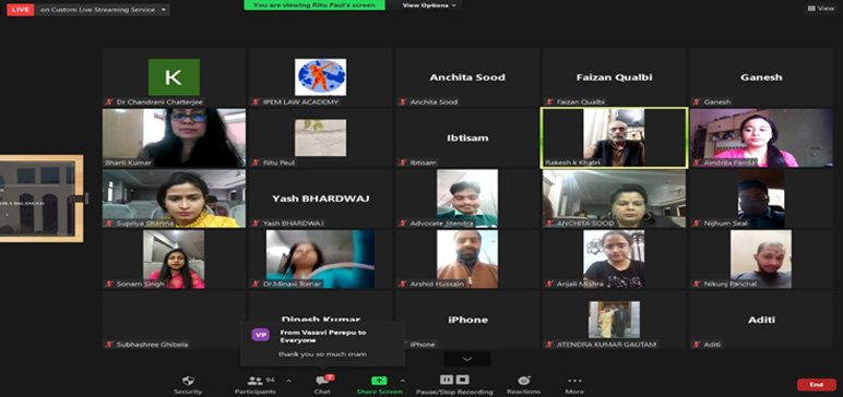 Dr. R.K Singhal, Director. IPEM then shared the words of wisdom with the gathering followed by Dr. Minaxi Tomar, Principal, IPEM Law Academy who gave the opening remarks. A total of 100 participants joined us on Zoom and others were connected with us on YouTube. It was an interactive and enlightening session with our guests Mr. Rakesh Khatri the Nest Man of India and Prof (Dr.) Bharti, Professor of Law at National Law University, Delhi. In the end, a Vote of Thanks was delivered by Dr. Neelam Seam, HOD, IPEM Law Academy thanking the Guests and Attendees for spending their Sundays virtually with us and being a part of this Webinar thereby making it a success.
